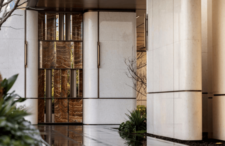 在门庭的环岛空间◈✿,景墙面采用中轴对称的设计布局◈✿,定制了奢石镶嵌装饰◈✿,将曲面艺术与经典石器之美圆融交融◈✿。